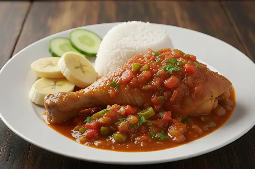 Pollo cocinado en salsa criolla y especias, logrando un guiso exquisito al estilo cumbanchero.