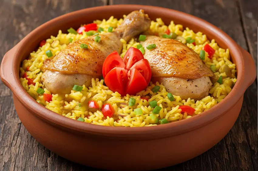 amarillo cocinado junto a trozos de pollo y vegetales, logrando un plato