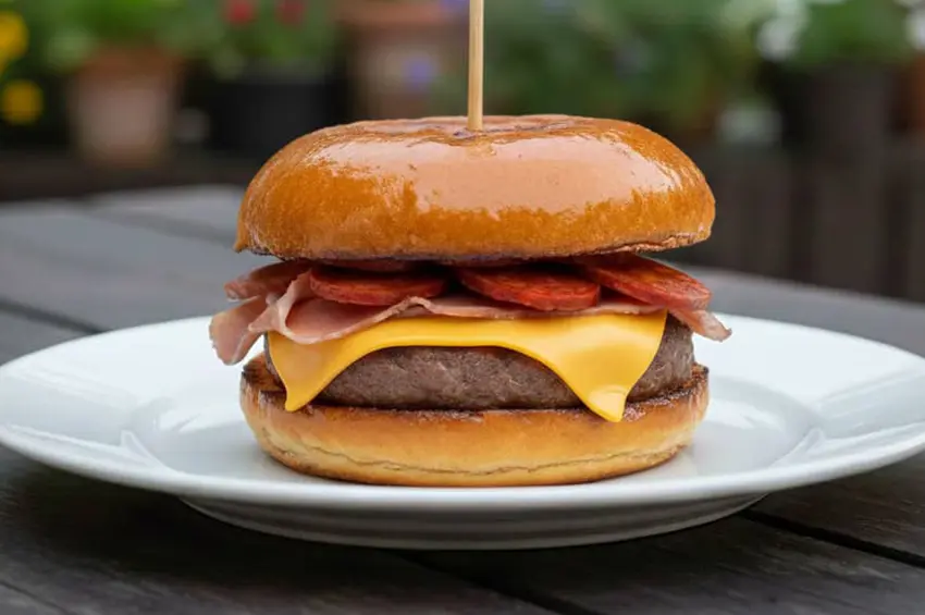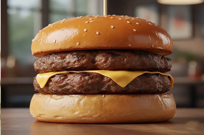 Doble ración de Carne, Queso, Pepinos encurtidos, Kétchup y Mostaza